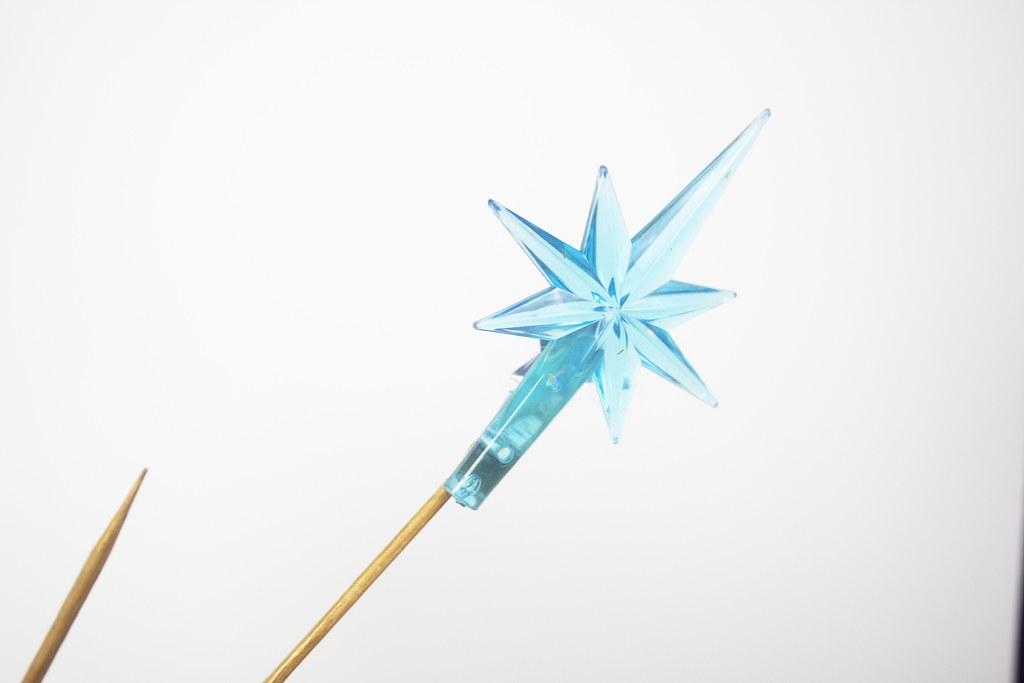 This crown is embellished with emerald and clear phinestones and topped with acrylic stars in yellow and blue colors.
