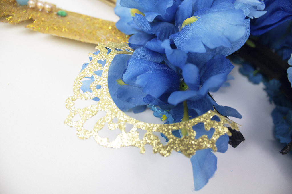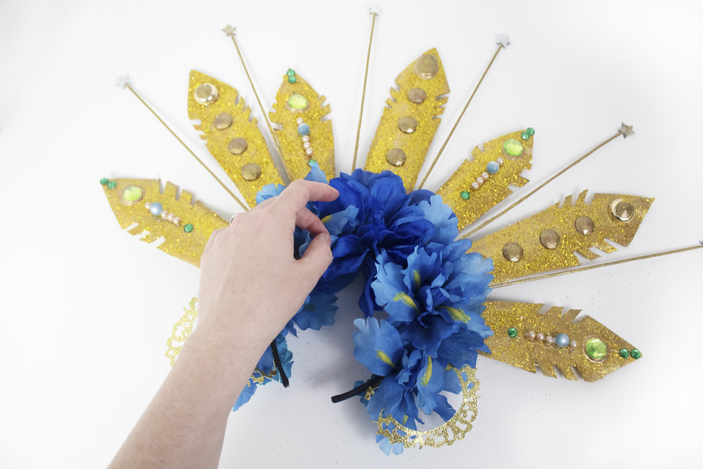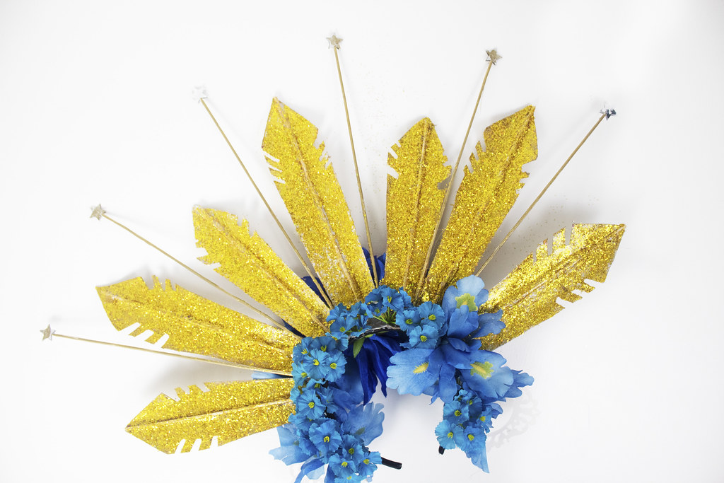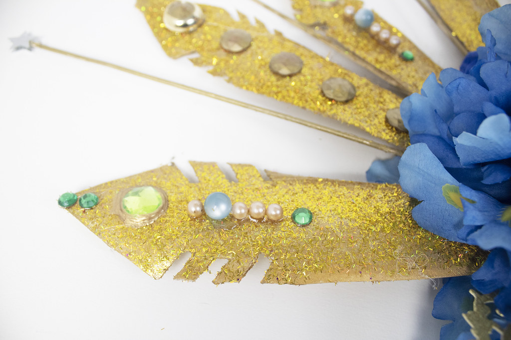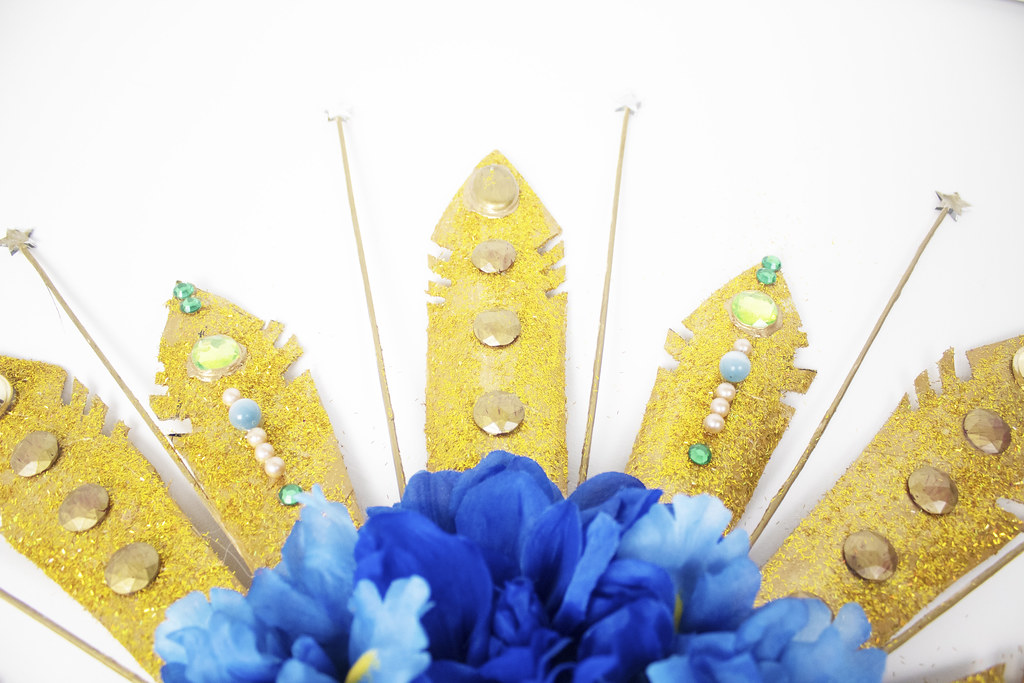 Made with glittered cardboard, faux flowers, rhinestones, wooden skewers and silver plastic stars.